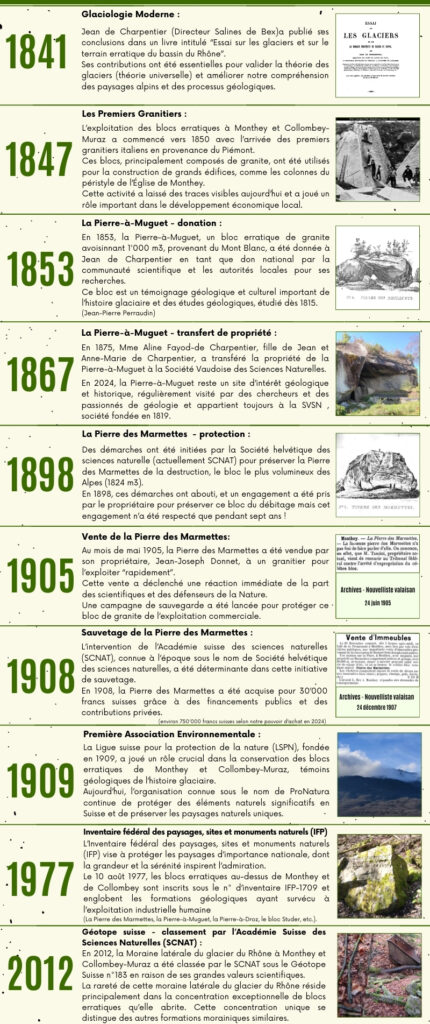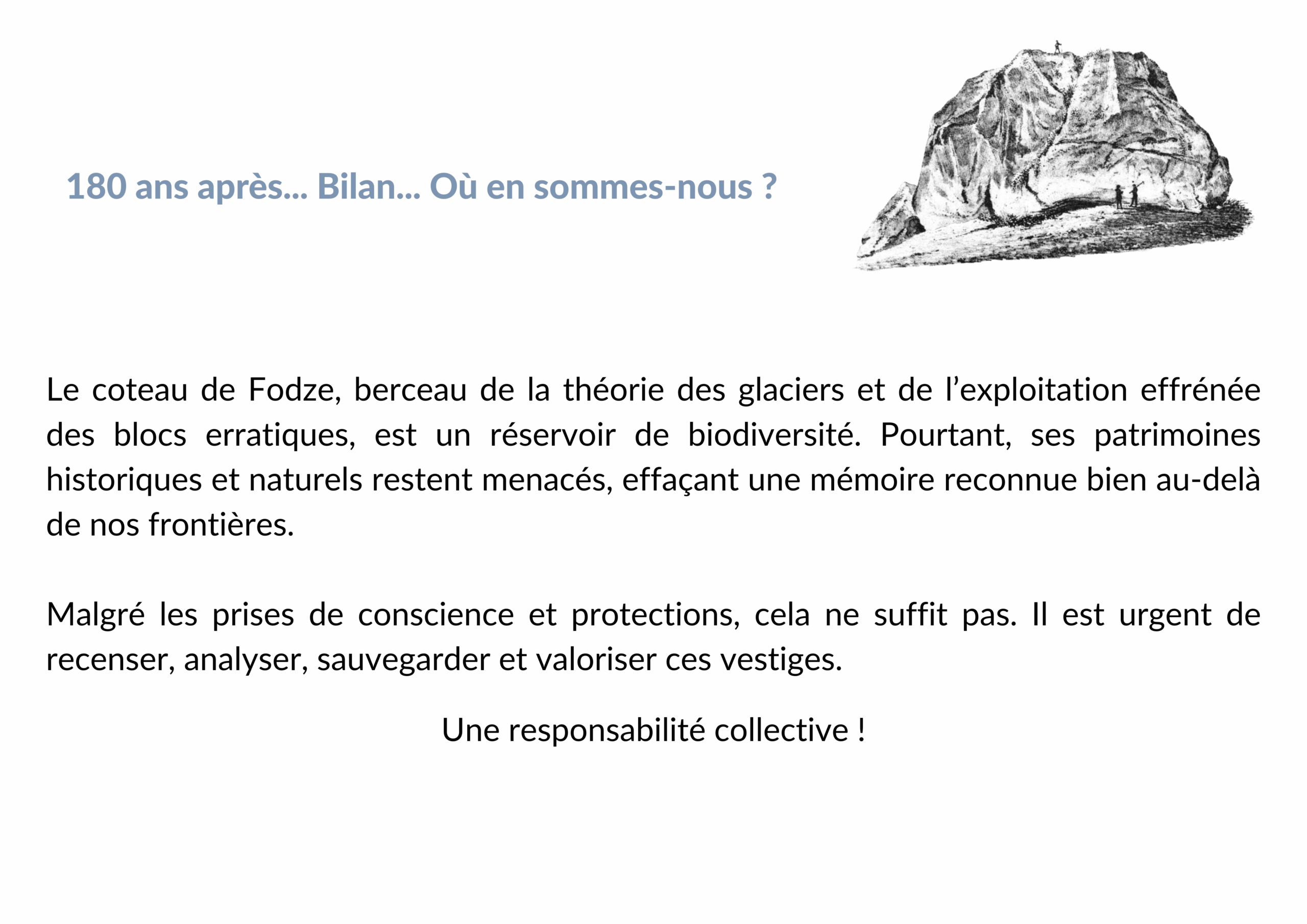 Malgré cela, ces forêts montrent une telle résilience qu’elles demeurent un véritable réservoir de faune et de flore typiques de notre région !Lors de l’exploitation des blocs erratiques, la collectivité avait déjà pris conscience de l’importance de préserver les ressources naturelles, une prise de conscience qui a été le précurseur de la création de la première association environnementale suisse et de la mise en protection jusqu’au niveau fédéral.